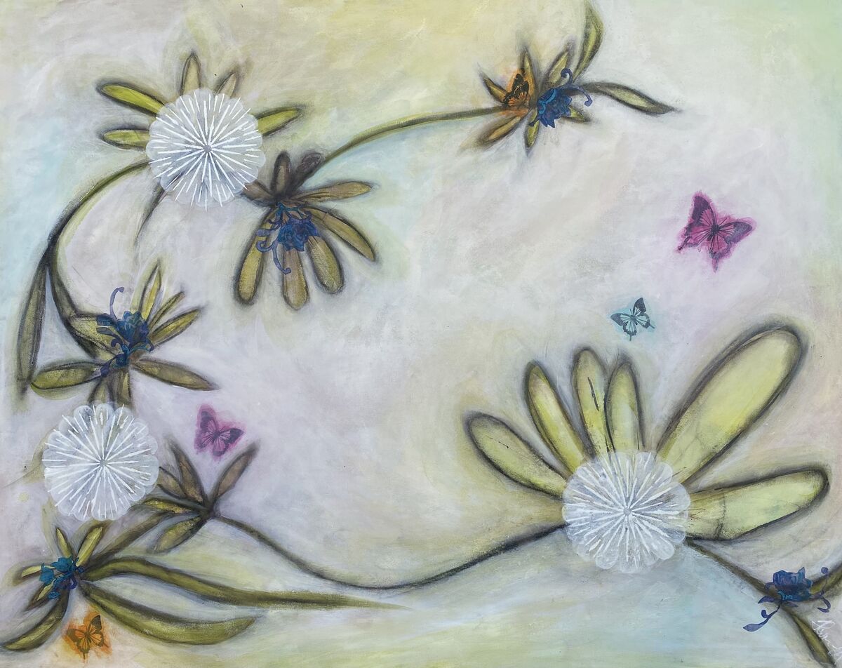 Mixed media. Acrylic, ink, charcoal and tissue paper on canvas.