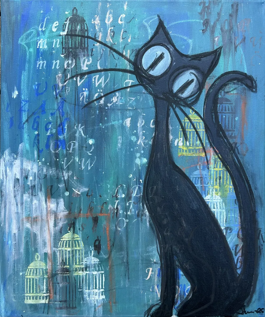 Acrylic, charcoal, oil pastels and Tri Art Liquid Glass on canvas.