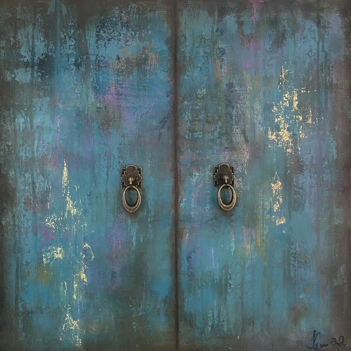 Acrylic and metal pull handels on canvas.