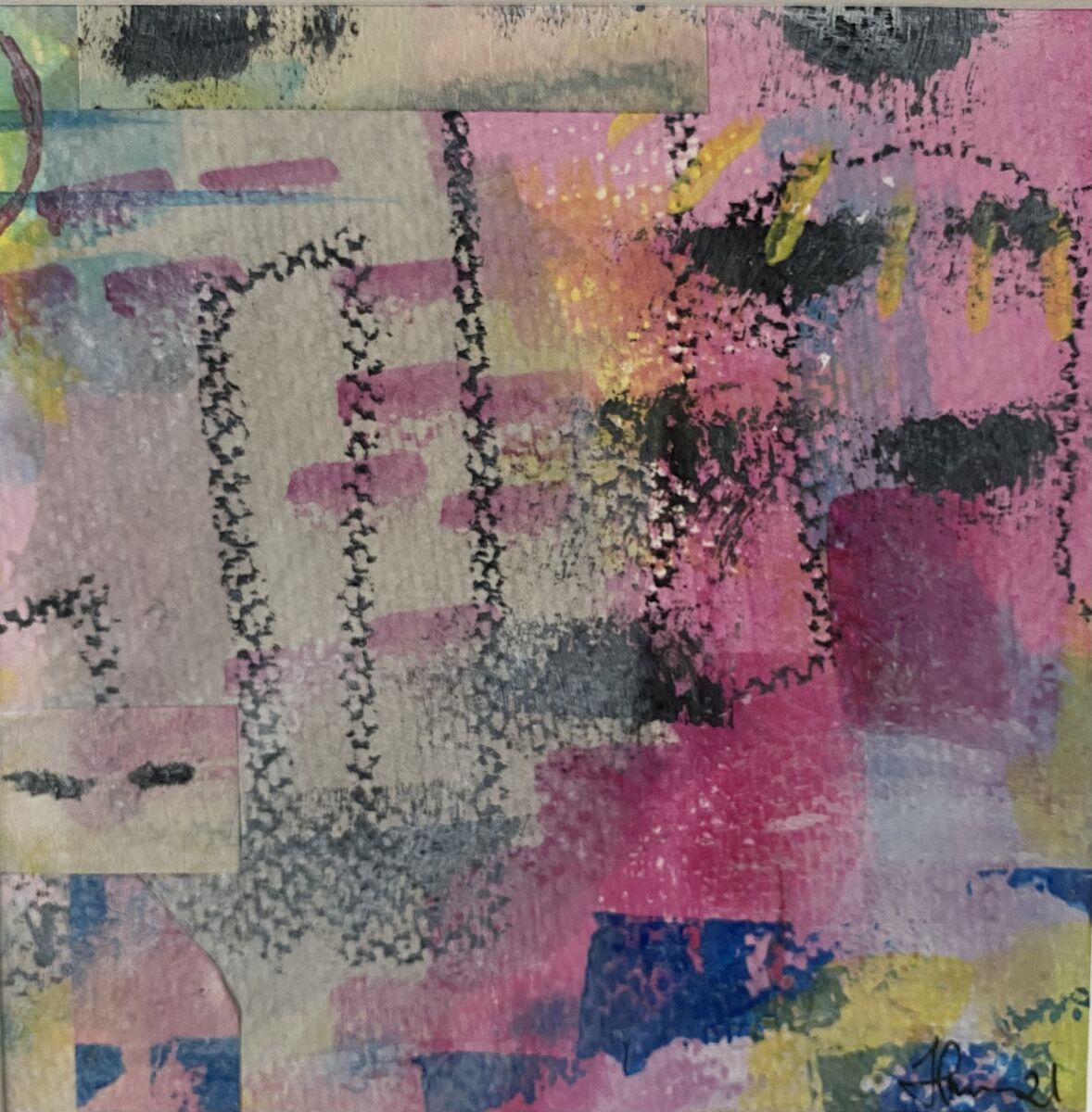 Acrylic and oil pastels on paper, mounted in white passepartout, 22 × 22 cm.