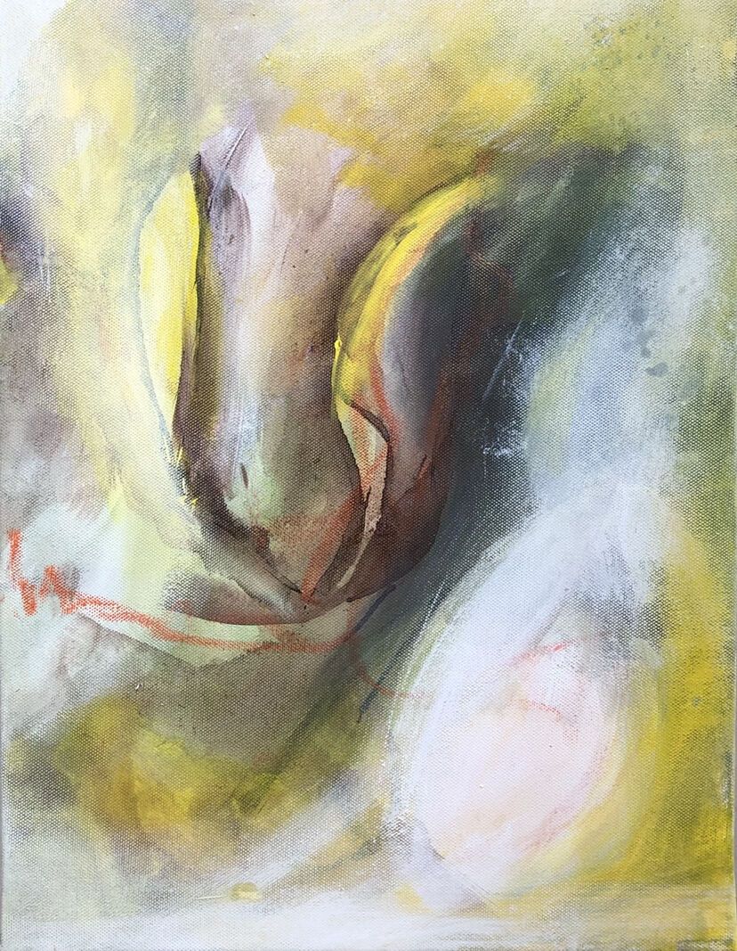 Acrylic and oil pastels on canvas.