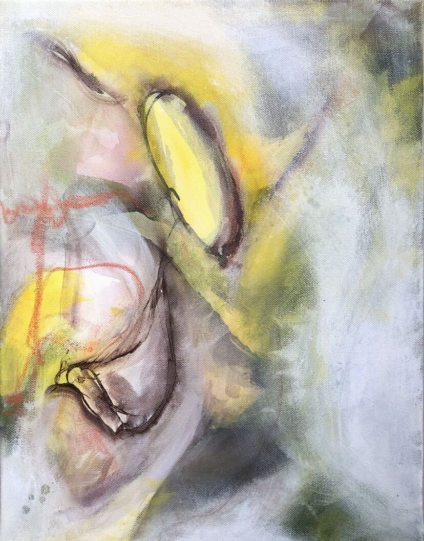 Acrylic and oil pastels on canvas.