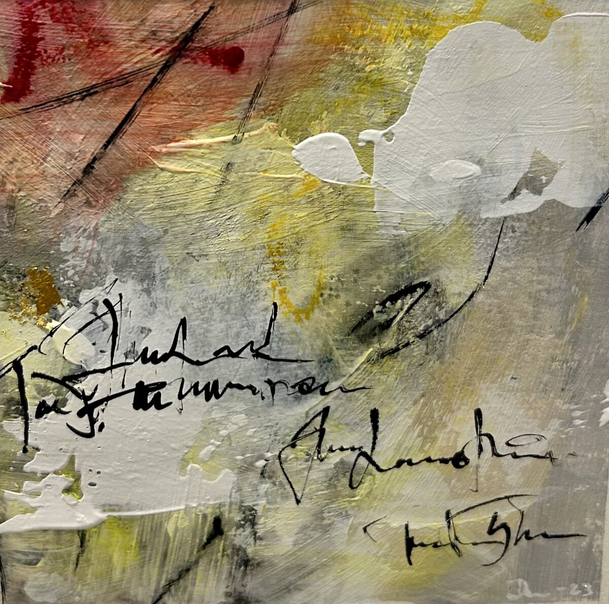 Acrylic, ink, oil pastels and gold leaf on paper. Including white passepartout 22x22cm.