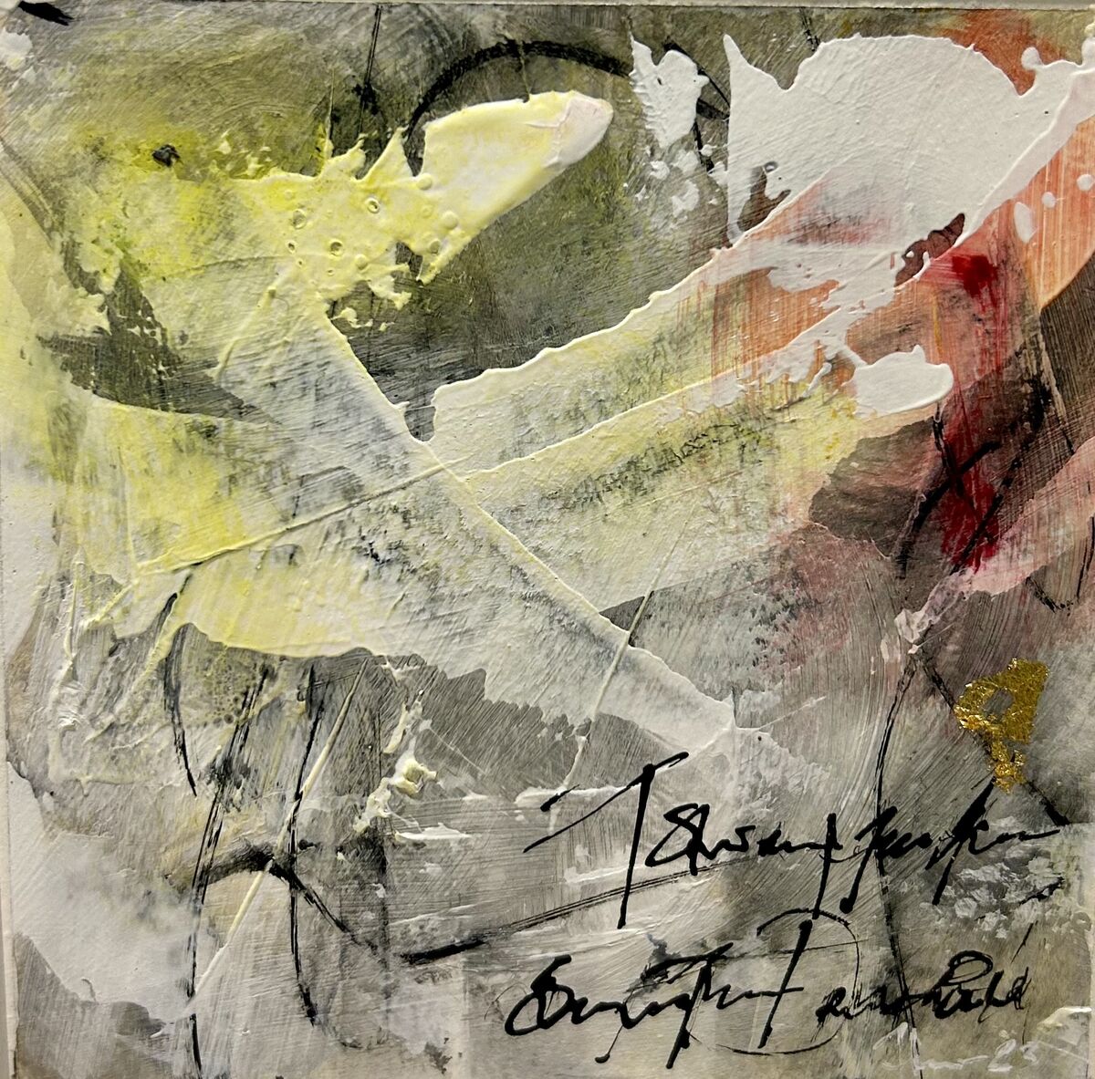 Acrylic, ink, oil pastels and gold leaf on paper. Including white passepartout 22x22cm.